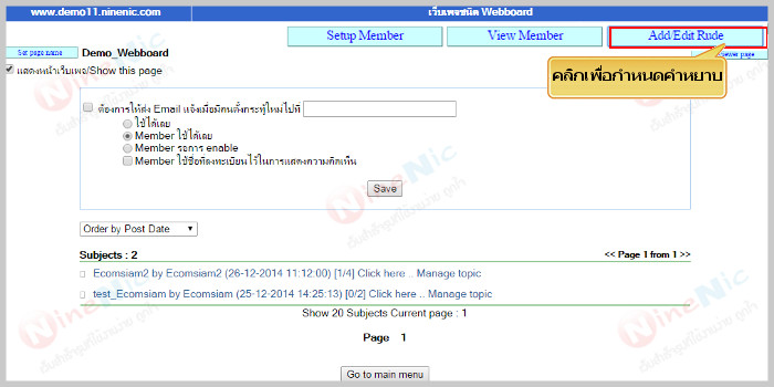 | เว็บเพจชนิดกระดานข่าวสาร (Webboard) | การกำหนดการสมัครสมาชิก |
