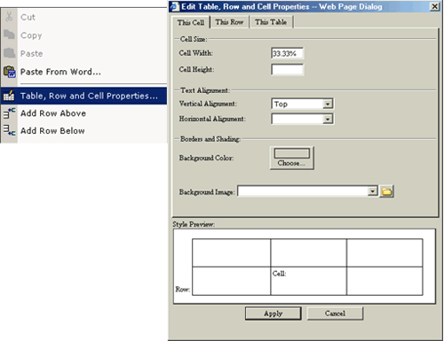 2. คลิ๊กที่ไอคอน หรือจะคลิ๊กขวาบนหน้าจอแล้วเลือก Edit Table, Row and Cell Properties ปรากฏหน้าจอดังรูป |