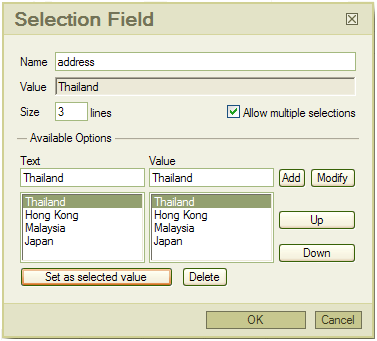 Value : เป็นการระบุข้อความที่ต้องการให้แสดงผลผ่านเบราเซอร์ เช่น ทำการคลิกเลือกที่ Thailand แล้วคลิกที่ Set as selected value ที่ช่อง Value จะมีคำว่า Thailand ดังรูปตัวอย่าง